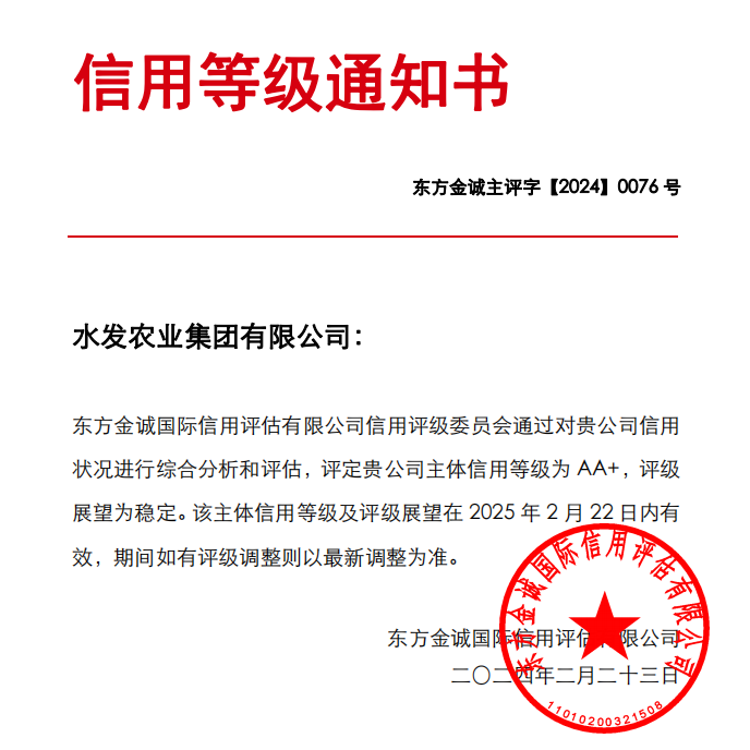 水發(fā)農(nóng)業(yè)集團(tuán)榮獲AA+主體信用評級